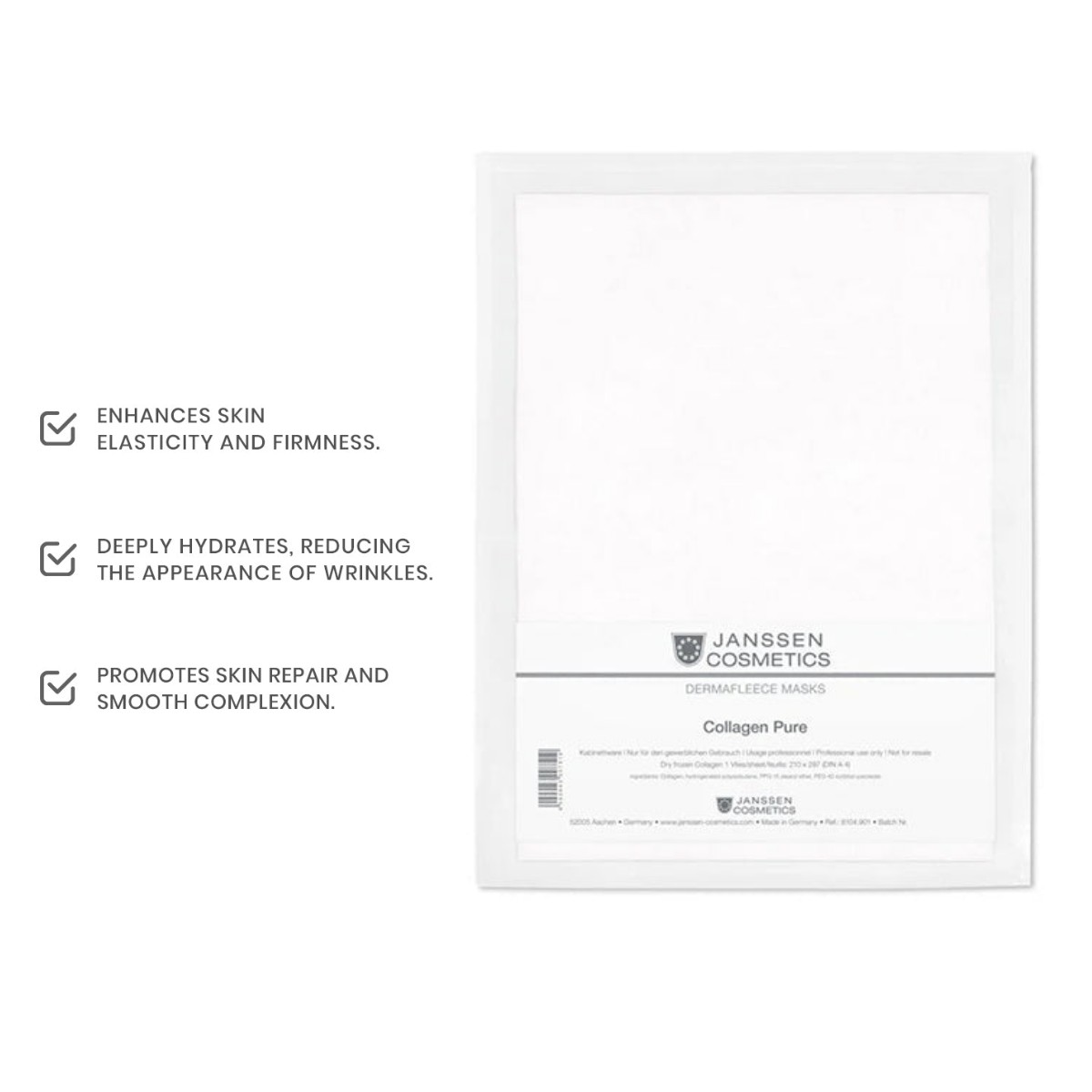Introducing the Janssen Derma Fleece Collagen Sheet Mask, a premium treatment from an extensive range of superior active substance masks. This exceptional collagen sheet mask is manufactured from high-quality collagen of extraordinary purity, treated in a special process to form a unique biomatrix.