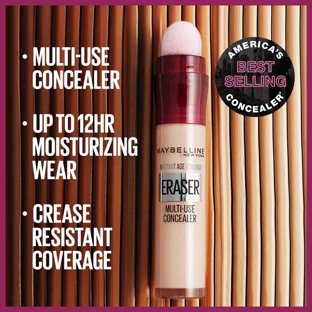 Meet the do-it-all concealer that moisturizes too! Instant Age Rewind Eraser is the revolutionary Maybelline Concealer that hydrates, conceals, contours, and corrects with just a click. Enjoy up to 12 hours of crease-resistant, moisturizing coverage that never settles into fine lines.