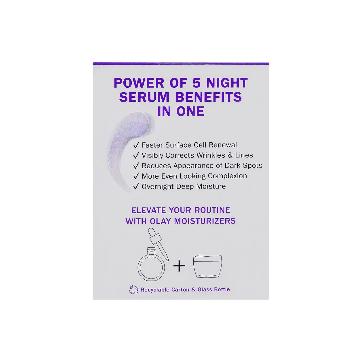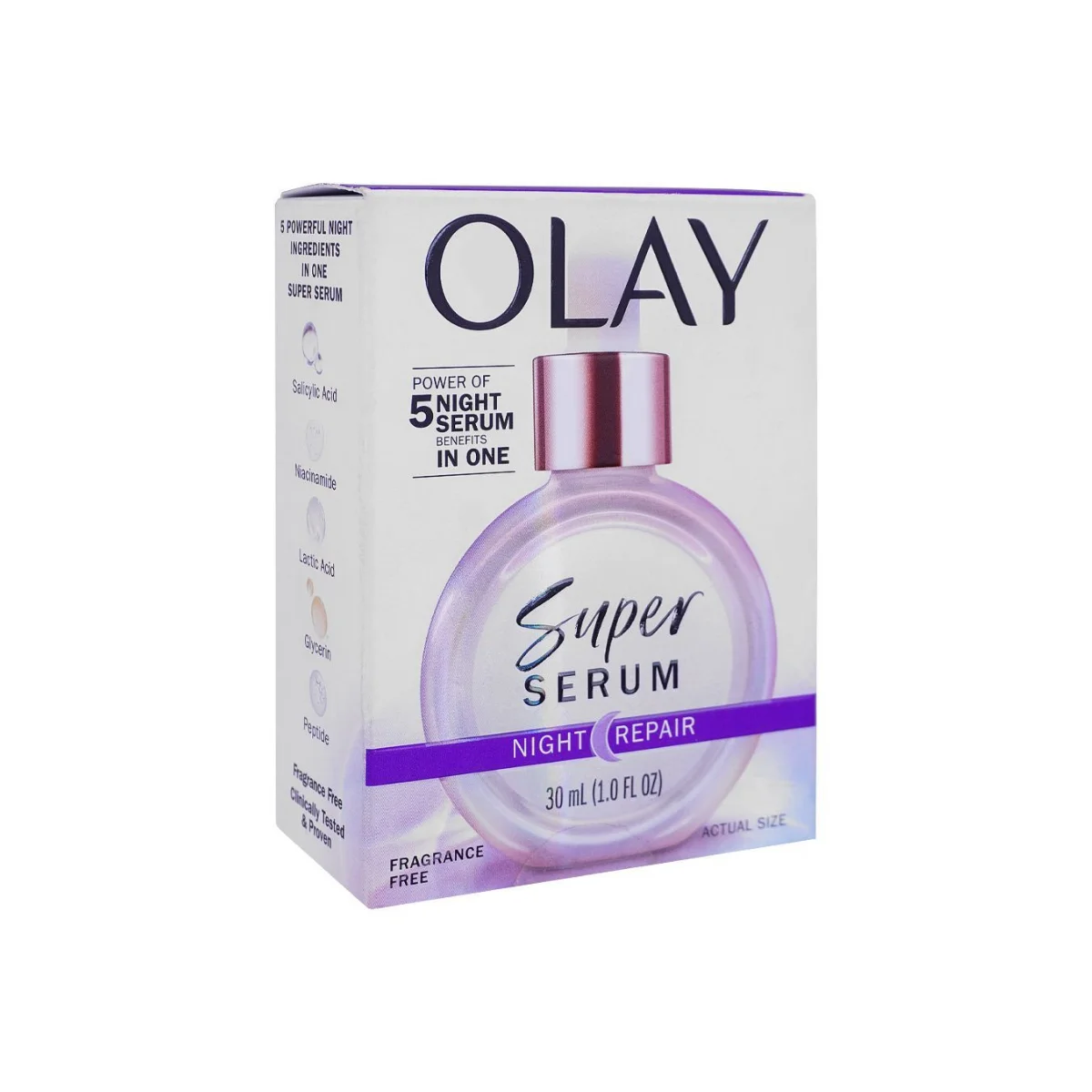 Olay Super Serum Night Repair 5-in-1 is a high-performance nighttime face serum designed to deliver five key skincare benefits while you sleep. The formula supports surface cell renewal, evening skin tone, deep moisture, fine line smoothing, and firmness improvement, all in one lightweight, fast-absorbing product. With a potent combination of niacinamide, peptides, lactic acid, salicylic acid and glycerin, this serum works intensively overnight to improve skin?s texture, boost radiance and restore a healthier-looking complexion by morning. Ideal for all skin tones and skin types who are looking to simplify their routine without sacrificing results, this serum creates the foundation for smoother, clearer and more resilient skin.