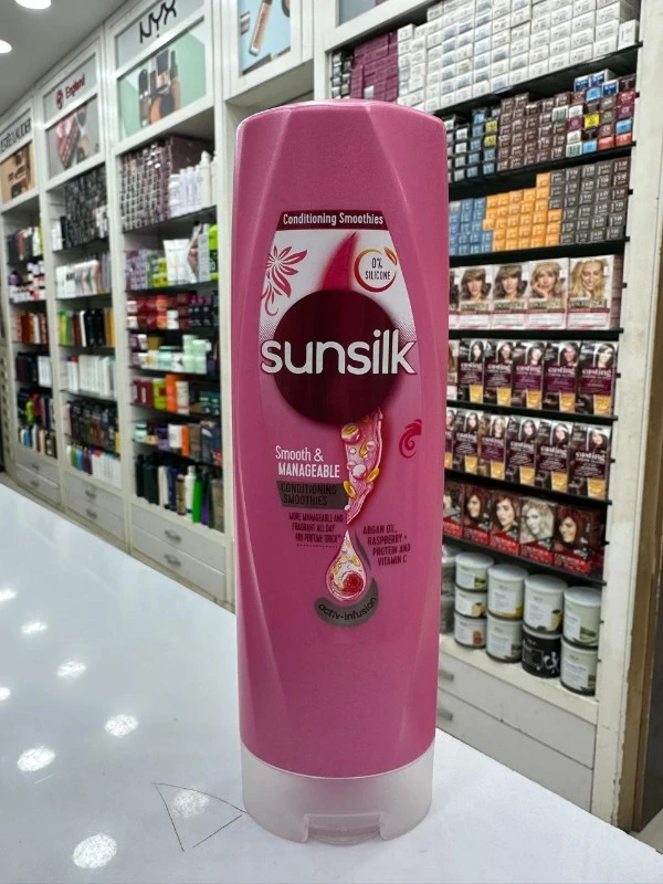 Sunsilk Smooth & Manageable Hair Conditioner tames frizz and nourishes with argan oil, raspberry, protein, and vitamin C. Silicone-free and lightweight, it leaves hair silky, smooth, and easy to style. Perfect for daily detangling and a glossy, manageable finish.